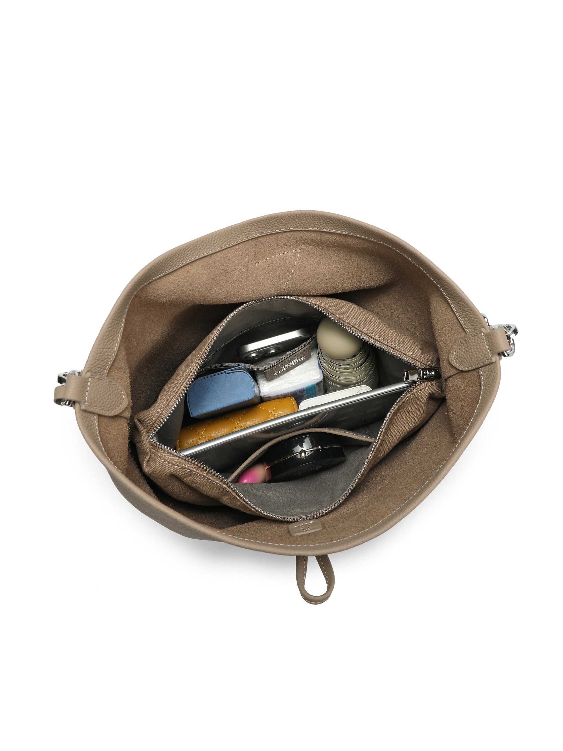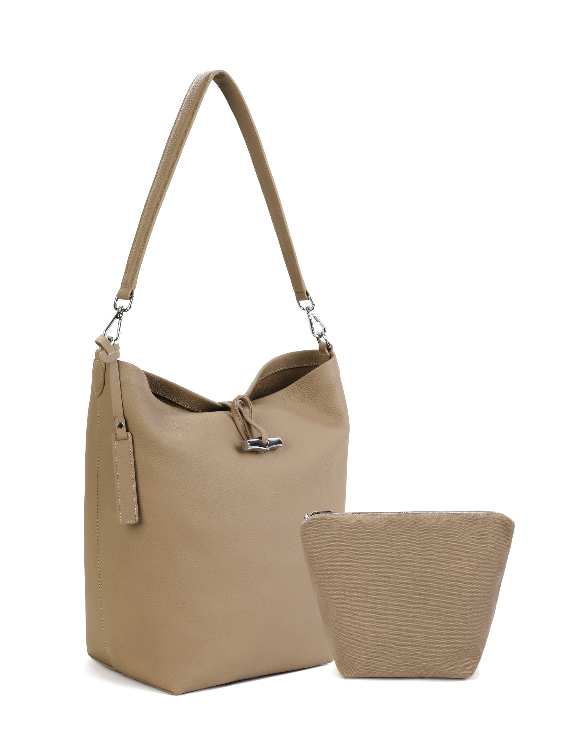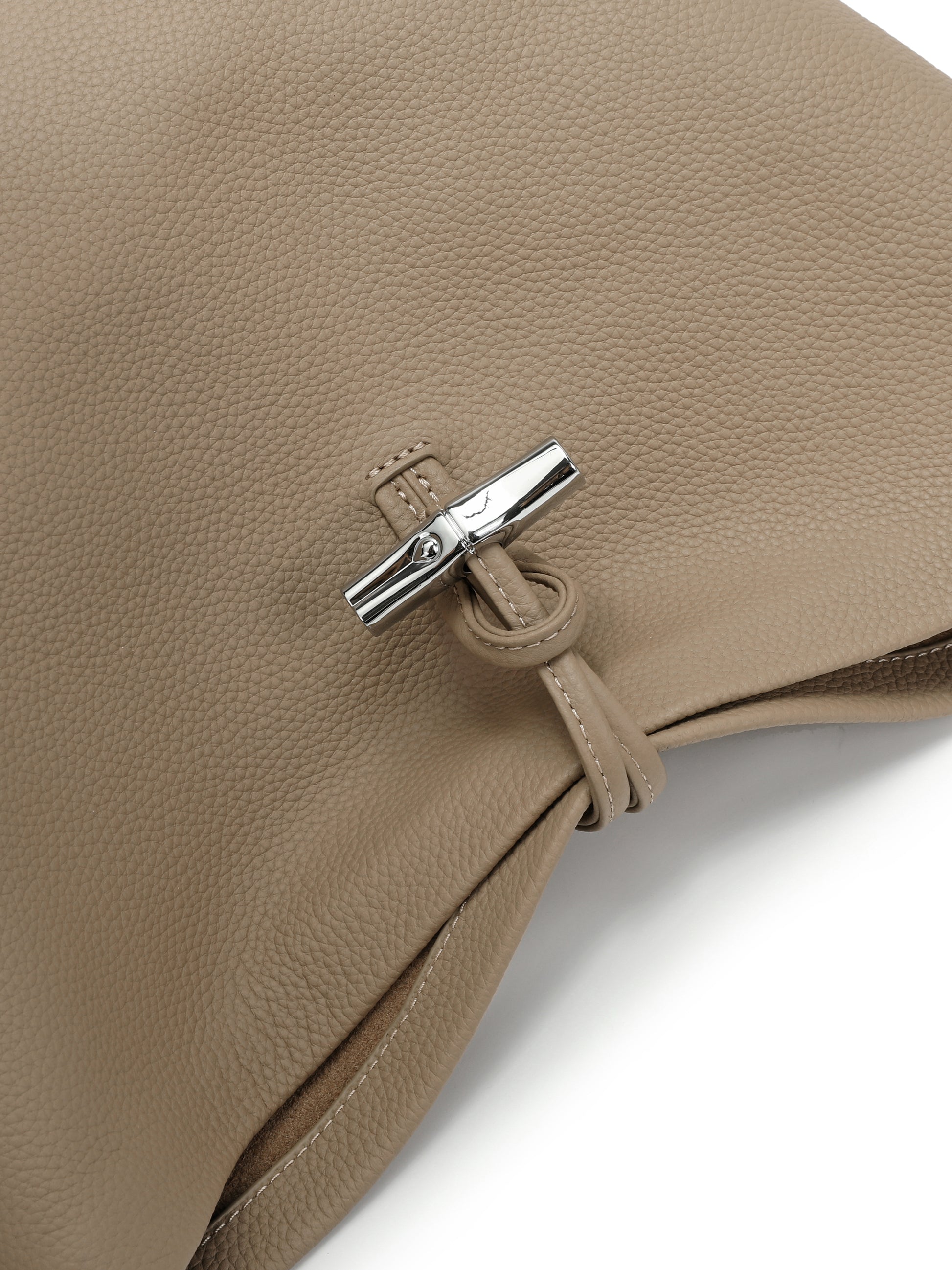 Crafted from supple pebbled leather, it folds naturally into a relaxed, sculptural shape that moves with you. The minimalist top-loop closure and adjustable shoulder strap give it a modern, understated look—quiet luxury without trying.